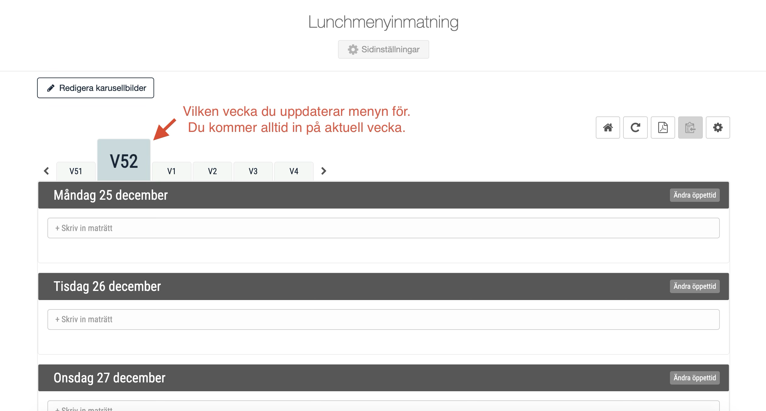 - Du har nu kommit till sidan ”Lunchmenyinmatning” och kommer alltid in på aktuell vecka.