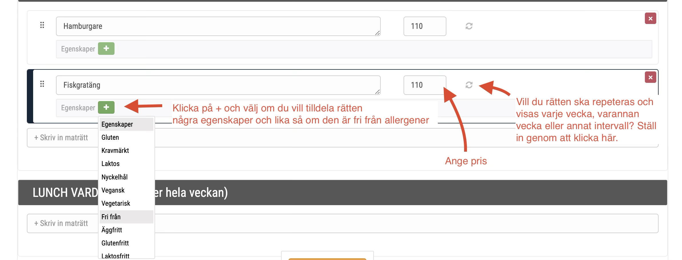 - Fyll i pris, märkningar (t.ex. vegetariskt) och allergener.