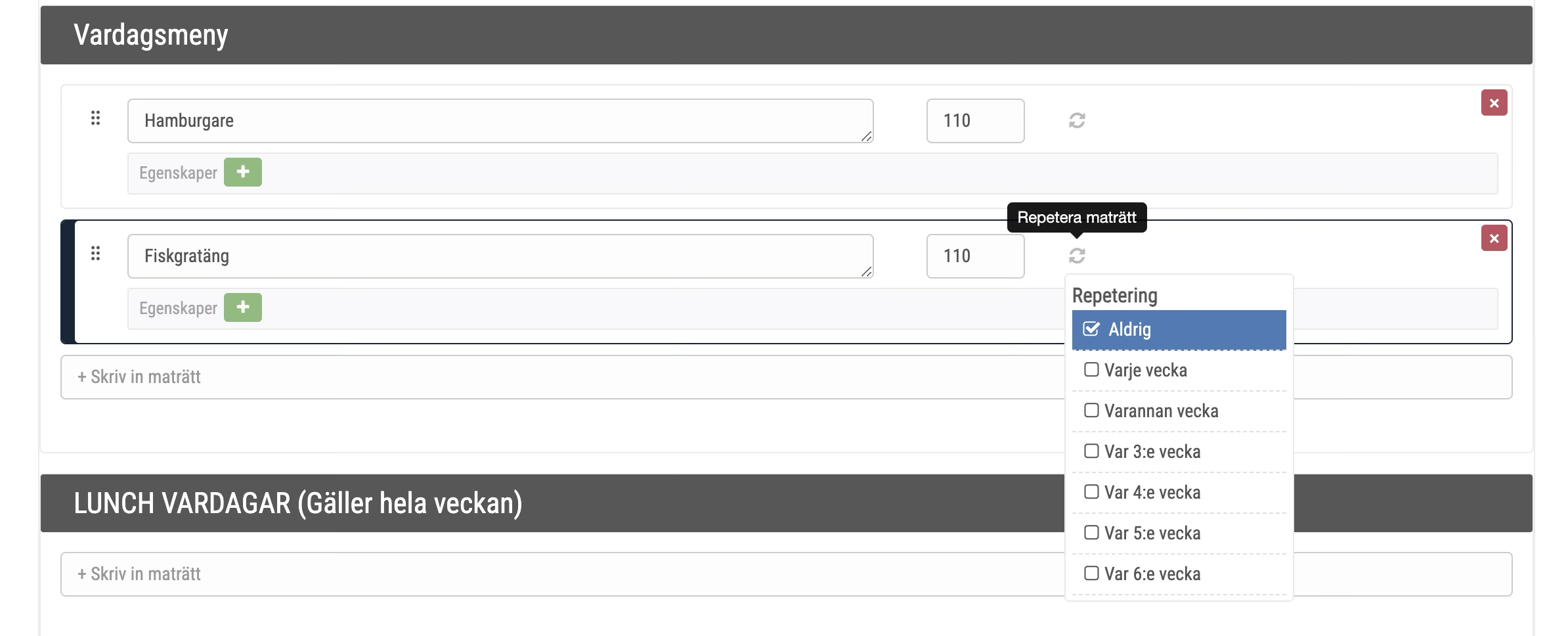 - Välj hur ofta rätten ska återkomma (t.ex. varje eller varannan vecka). Om du klickar i t.ex. var 3e vecka kommer den markeras och när du sedan sparar menyn kommer den att bli låst i menyn och exponeras var tredje vecka så t.ex. vecka 1, 3, 6, osv. tills du förändrar hur den ska repeteras.