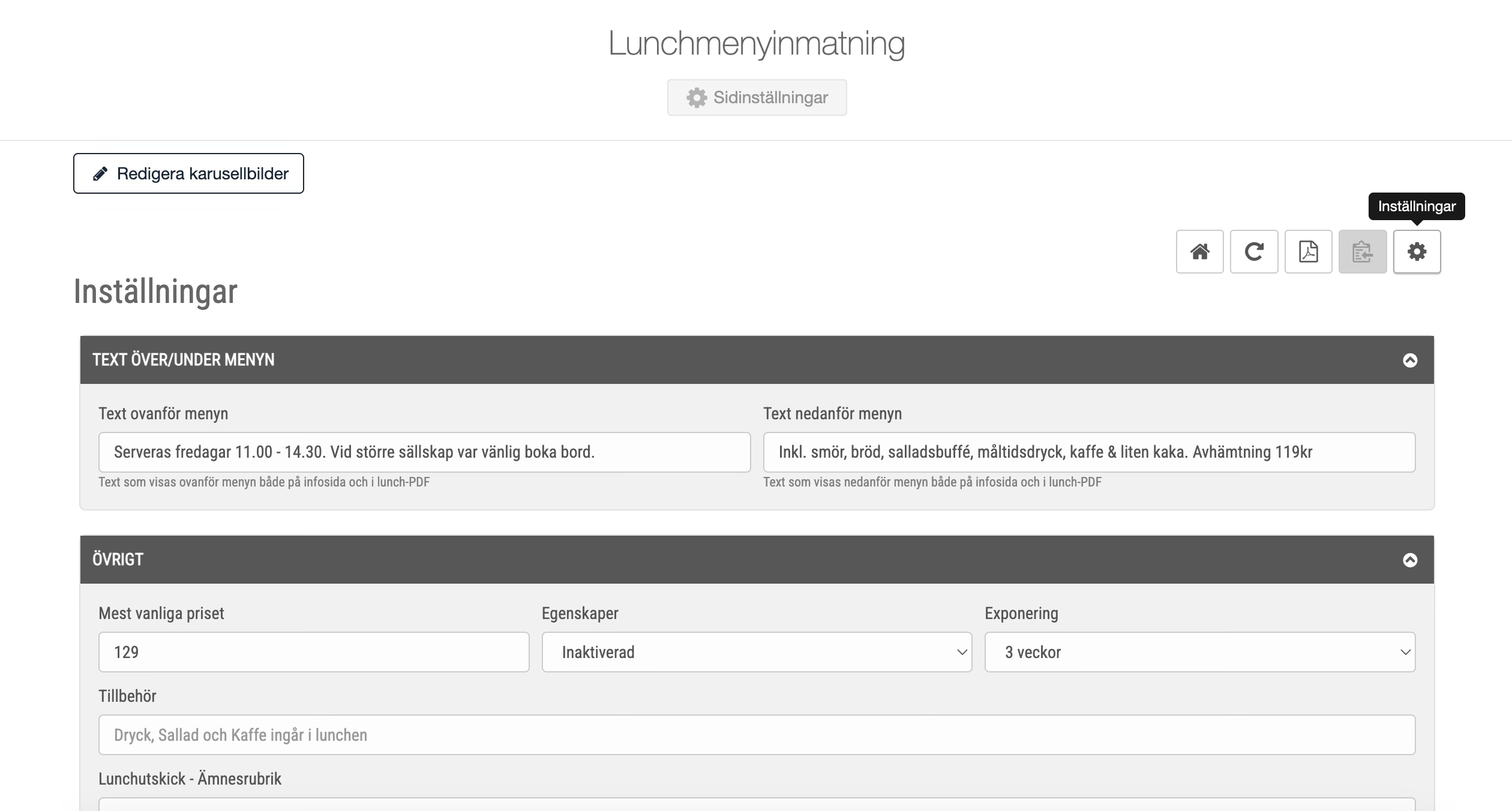 - Inställningar för matlådan här finns er menybank där era tidigare luncher sparas.