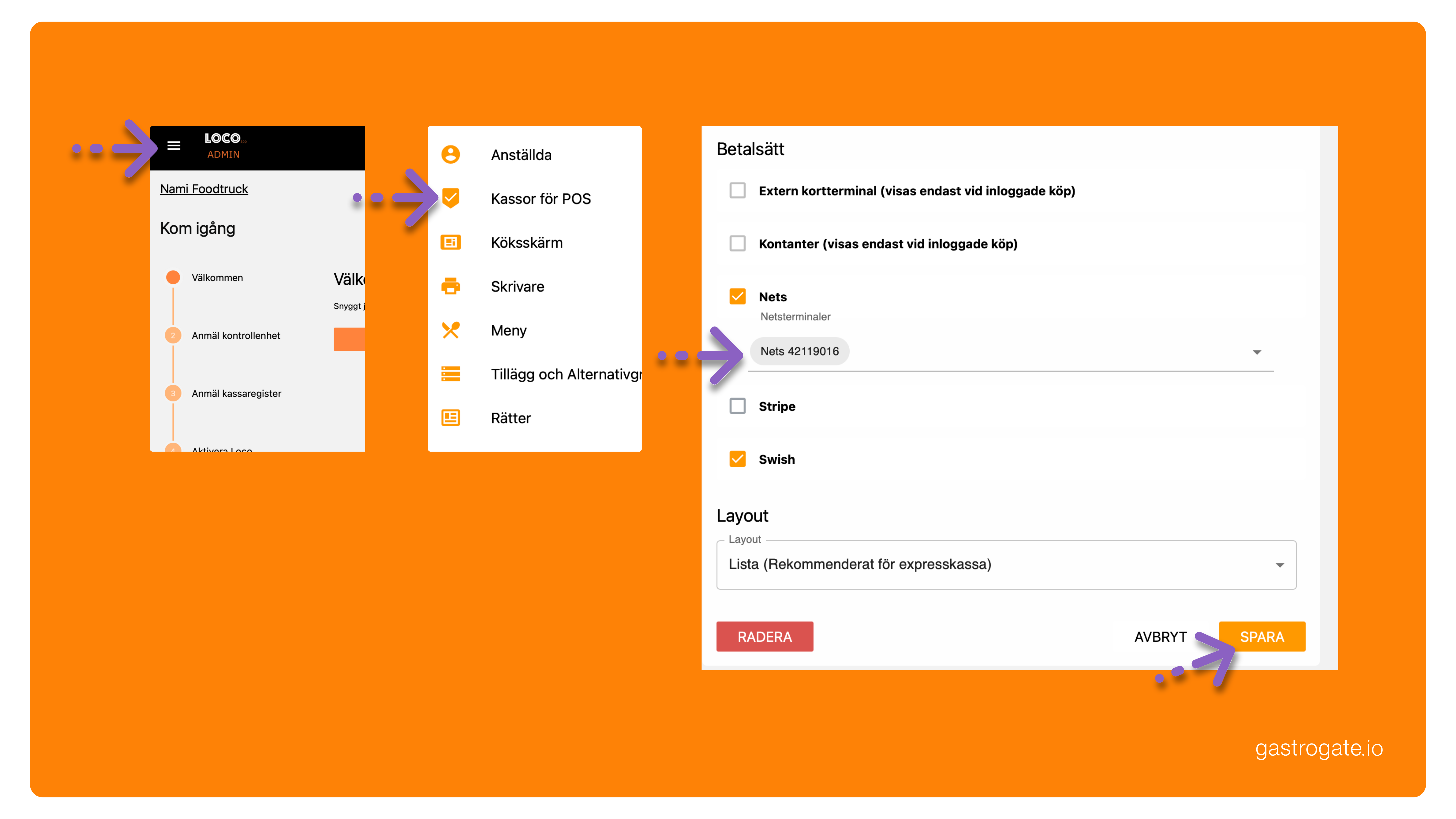 Navigera till sidan "Kassor för POS" genom sidomenyn. Klicka sedan på knappen "Lägg till" bredvid texten "Nets Connect@Cloud".