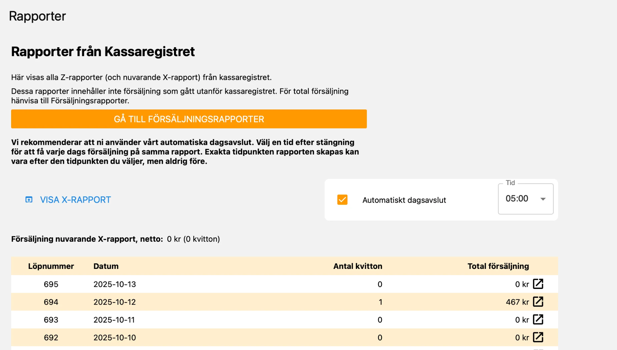 Syftet med Z- och X- rapporter i vårt system är att uppfylla de krav Skatteverket ställer på spårbarhet av köp i kassaregister. För att ta fram försäljningsstatistik och visa det på ett bra sätt använder vi oss av sidomenyn —>Rapporter istället. Vilket kombinerar Z-rapporter och rapporter från driftavbrott av kontrollenheten.