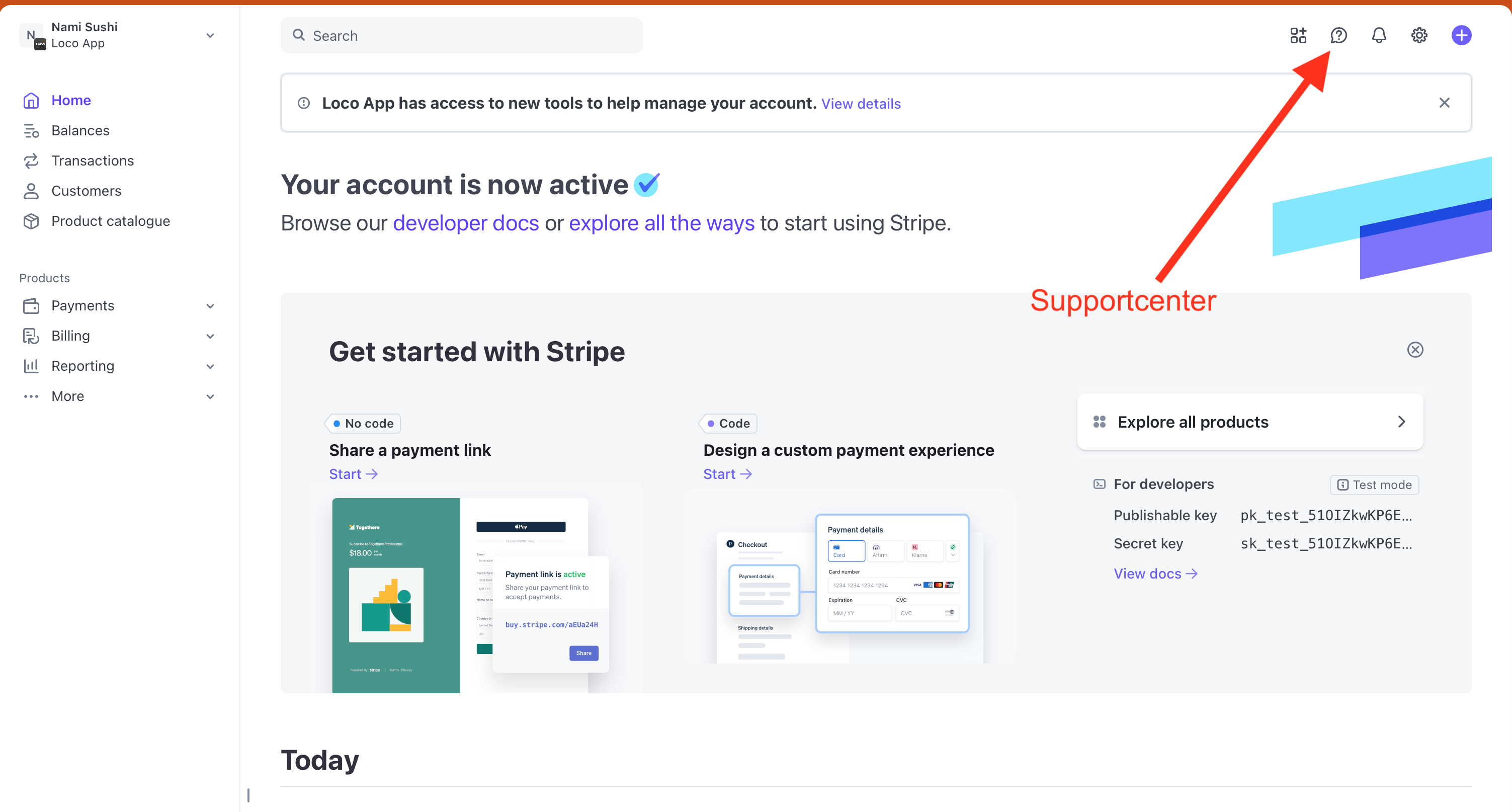 - Öppna hjälpen i Stripe: Klicka på hjälpikonen (frågetecknet) uppe till höger i Stripe Dashboard . När du klickar där visas en meny med alternativ. Välj Supportartiklar (eller liknande alternativ för hjälpcenter) i menyn för att öppna Stripes supportcenter.