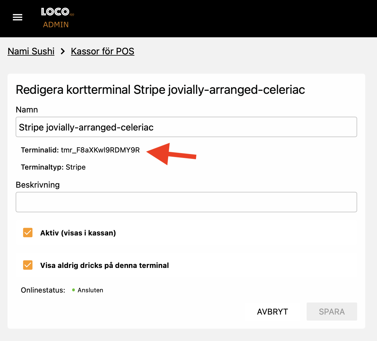 terminalidgenom att gå in på backoffice.thelocoapp.com > sidomenyn > Kassor för POS och lokalisera betalterminalen du vill felanmäla.